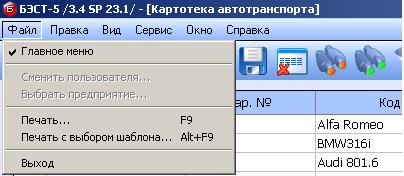 Выбор пункта меню Файл позволяет перейти в главное меню, режимам печати отчетов, документов, реестров, выходу из приложения.